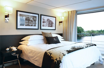Built and launched in 2009, the elegant and unique Zambezi Queen accommodates 28 passengers in 14 cabins all of which have their own private balcony and have been tastefully furnished with either a double bed or two single beds. Of the 14 suites, four are master suites with their own private outdoor area.