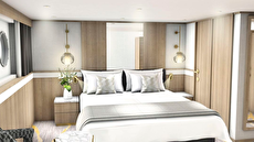 Deck 3 Superior French Balcony Cabin (10) Just like the superior cabins on Deck 1, these ones line up a king-size bed, which can be made into two singles, plus a desk and a lounge chair. They’re still 15m², but floor-to-ceiling glass doors lead out onto a French balcony. Please note, the cabin image is the planned appearance. |