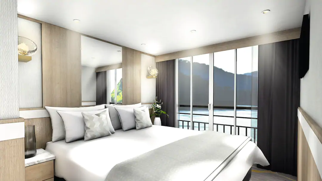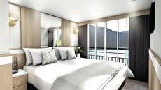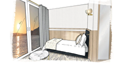 Deck 2 Superior French Balcony Cabin (6) Just like the superior cabins on Deck 1, these ones line up a king-size bed, which can be made into two singles, plus a desk and a lounge chair. They’re still 15m², but floor-to-ceiling glass doors lead out onto a French balcony. Please note, the cabin image is the planned appearance. |